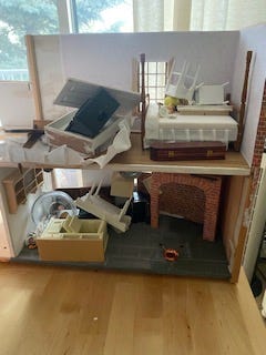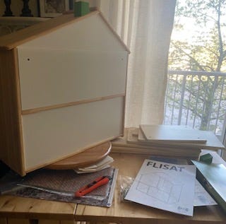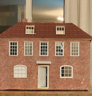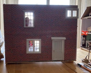 Once the door piece was attached, I added the floor and inserted the stair case that leads to the Austen sisters bedroom. Then I put everything back in place, and painted the window frames. The outer brick needs to be patched in places and changed in others. I wrecked the paper by going too fast and not lining it up to match where the two structures join. No pictures at this time, because I have to get more brick.